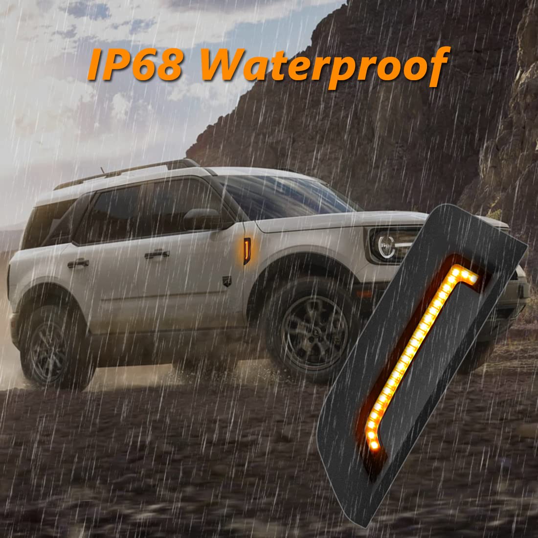 - 24 high-power SMD LED chips are built into each LED side marker light. Super bright light output maximizes driver and passenger side visibility, let your Bronco can clearly illuminate the surrounding dark area. It can also drive in heavy rain, snow, fog or at night, make your driving safer and better surrounding visibility.